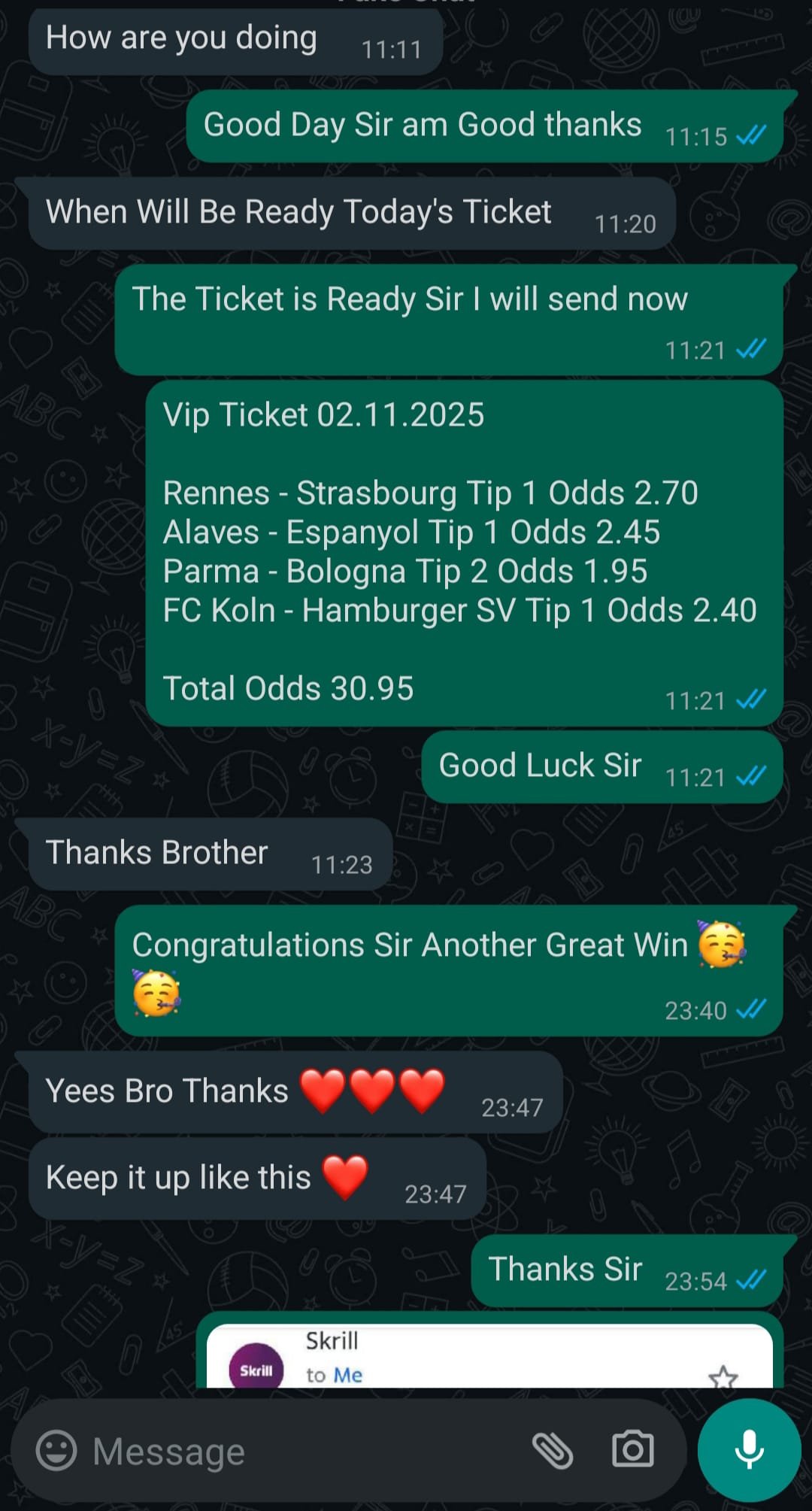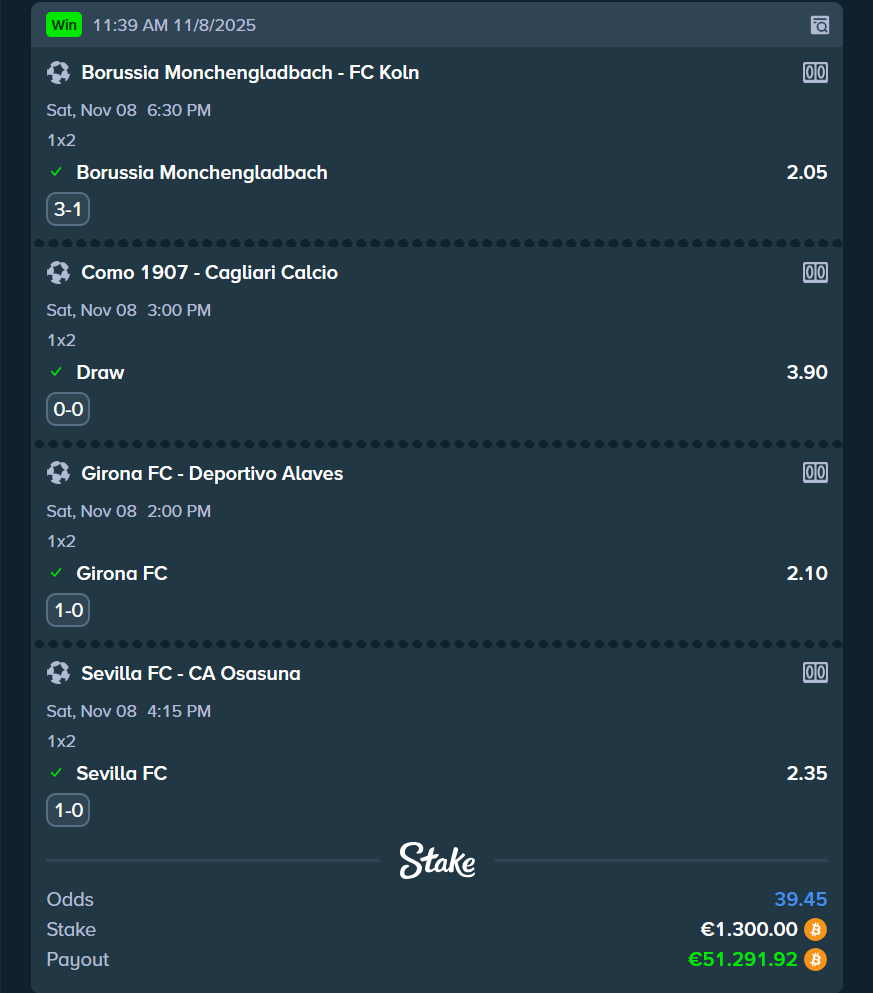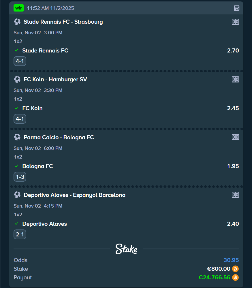 | 02.11.2025 | FC Koln – Hamburger SV | 1 | 2.45 | 4:1 |