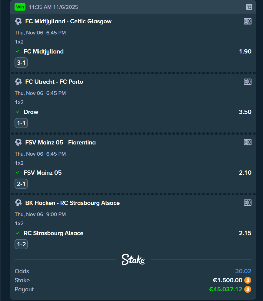 | 06.11.2025 | Midtjylland – Celtic | 1 | 1.90 | 3:1 |